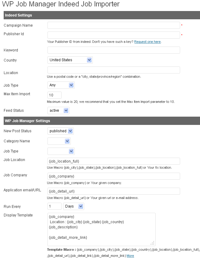 • Job Type List of job Types from WP Job Manager . The Indeed job imported from above settings will be inserted in that type
